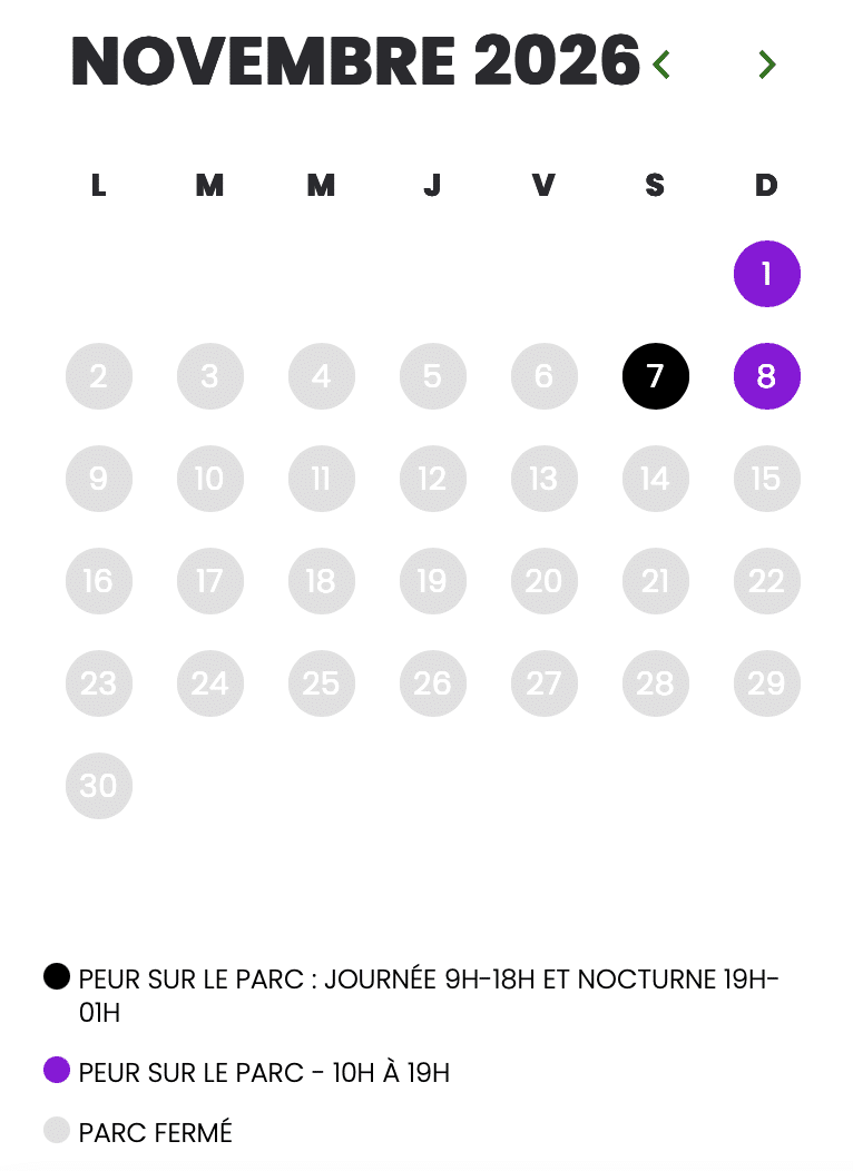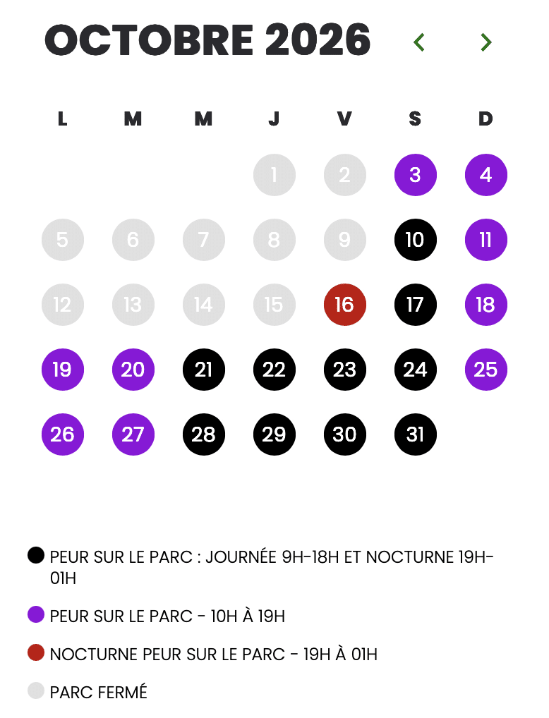 - Peur sur le Parc (billet jour) : de 9h00 à 18h00 ou de 10h00 à 19h00