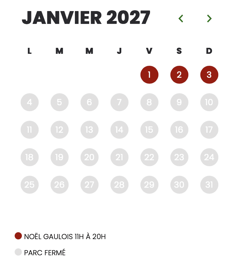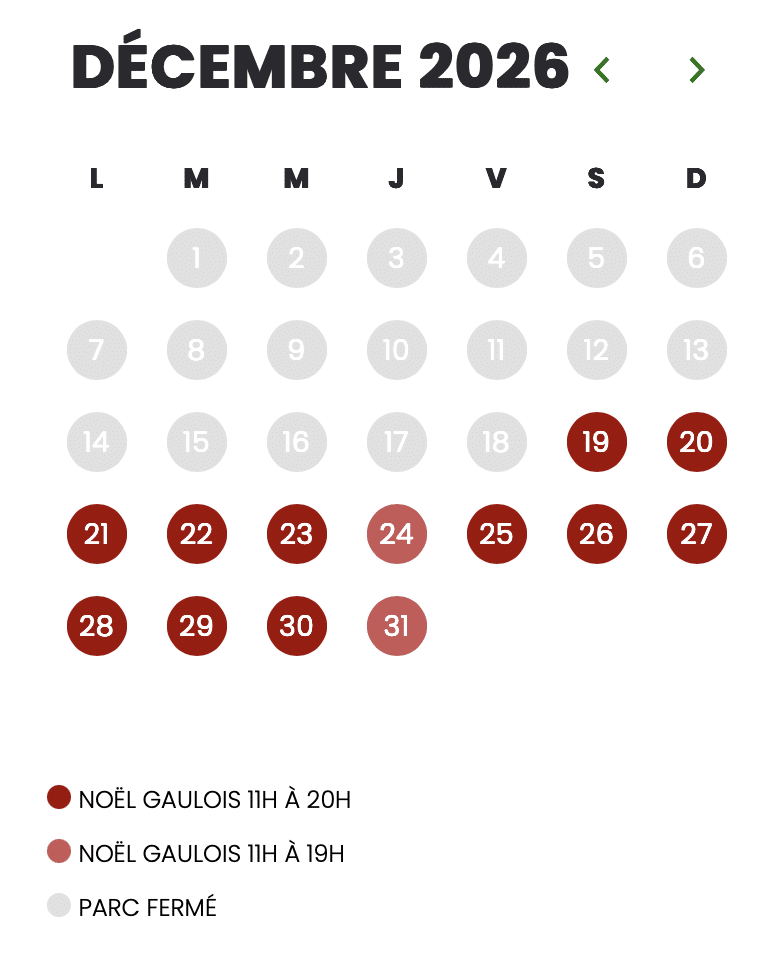 - Noël Gaulois : de 11h00 à 20h00 (sauf le 24/12 et le 31/12, fermeture à 19h00)
